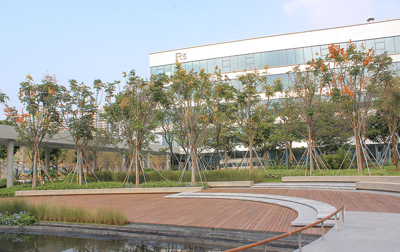 vivo全球總部項(xiàng)目位于東莞市長(zhǎng)安鎮(zhèn)新安社區(qū),由中國建筑設(shè)計(jì)研究院負(fù)責(zé)全部建筑設(shè)計(jì)和景觀設(shè)計(jì)。設(shè)計(jì)師設(shè)計(jì)了一系列清晰、簡(jiǎn)潔的幾何形體和空間,由一套連廊系統(tǒng)將它們有機(jī)連為一體,每一個(gè)空間獨(dú)特但不孤立,緊密地聯(lián)接于空間體系之中,充分考慮了便利性、舒適度、美觀和空間張力,塑造了豐富的室內(nèi)空間、露臺(tái)、庭院、廣場(chǎng)、公園……,容納工作、居住、游憩、交通于一體,承載著vivo人全天候的工作與生活。園區(qū)中大量采用了桃花江的戶外竹材,涼亭、廣場(chǎng)地板、護(hù)欄扶手和休息座椅等區(qū)域都有分布,承載著職工們的交流、休閑、運(yùn)動(dòng)、Party和沙龍等功能,使他們工作更高效,生活更健康。