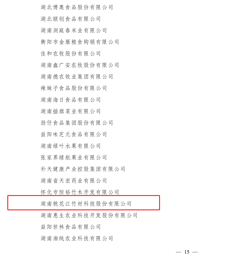 2021年12月30日公布的第七批農(nóng)業(yè)產(chǎn)業(yè)化國家重點龍頭企業(yè)名單中,湖南桃花江竹材科技股份有限公司成功入選。